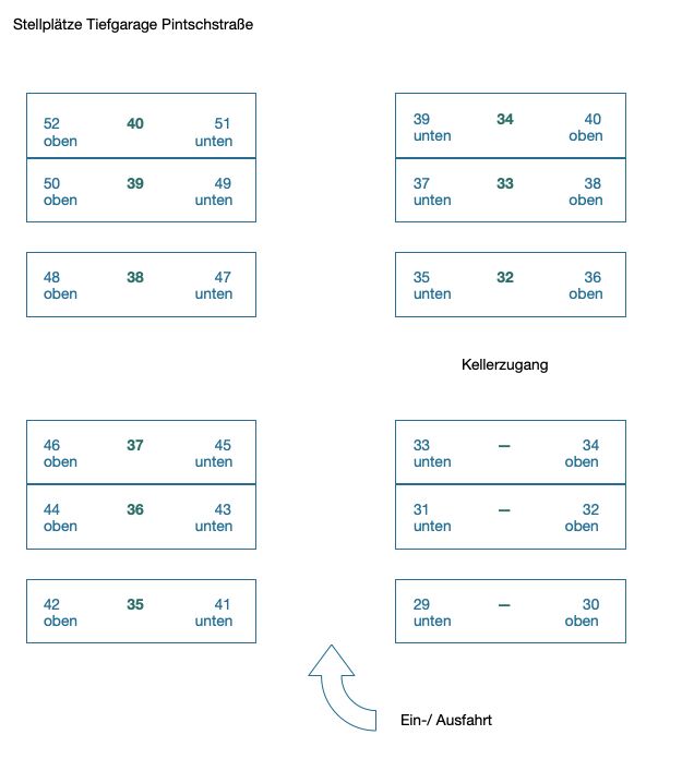 Alle Stellplätze sind aktuell vermietet, die 42 mit einer Monatsfrist, die 41 nach den gesetzlichen Bestimmungen kündbar und somit kann ein oder beide Stellplätze schnell zur Eigennutzung dienen.