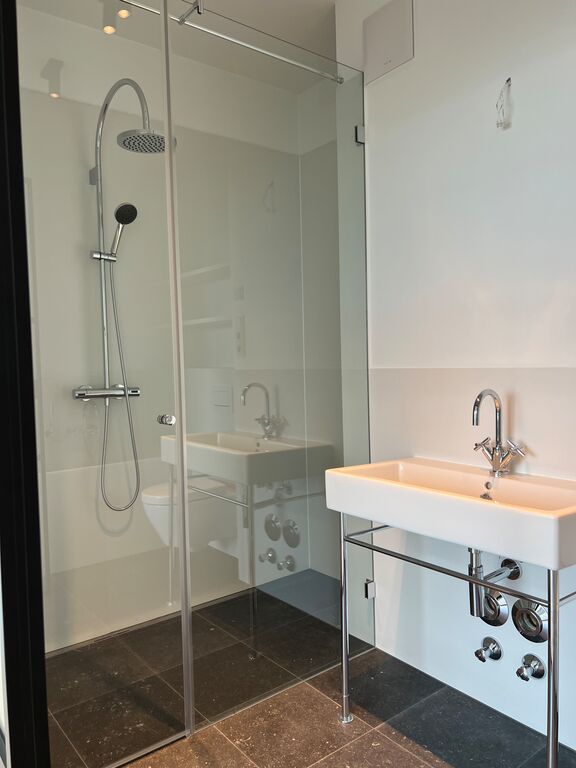Für maximalen Komfort sorgen Verschattungsjalousien und Design-Deckenbeleuchtungen mit zentraler Steuerung sowie eine individuell regelbare Fußbodenheizung. Die hochwertigen Dusch- und Wannenbäder mit Blaustein und edlen Fliesen, ergänzt durch ein Gäste-WC, runden das luxuriöse Konzept ab.