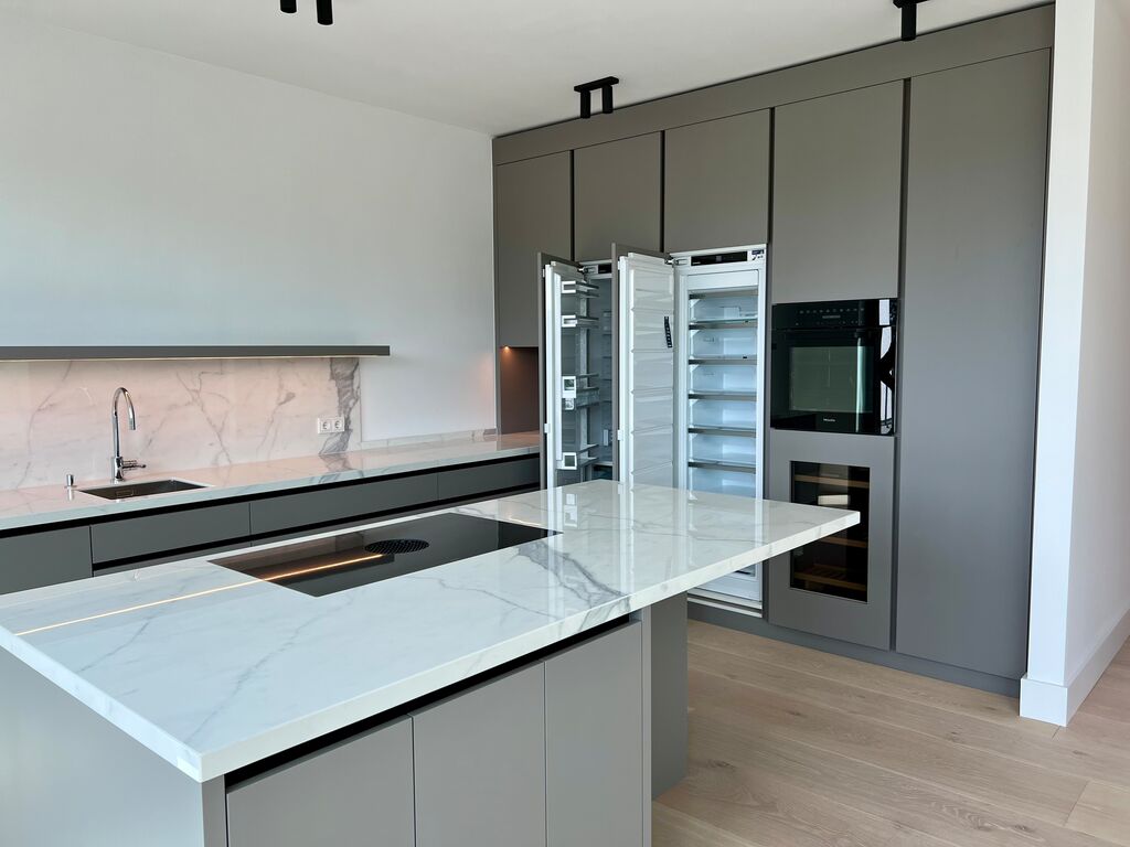 Ein privater Aufzug bringt Sie direkt in Ihre Wohnung, wo helle Eiche-Echtholzdielen, ein gemütlicher Kamin und ein offener Wohn-Ess-Kochbereich mit einer exklusiven Bulthaup-Einbauküche auf Sie warten. Hochwertige Materialien und durchdachte Details schaffen ein elegantes und stilvolles Wohnambiente.