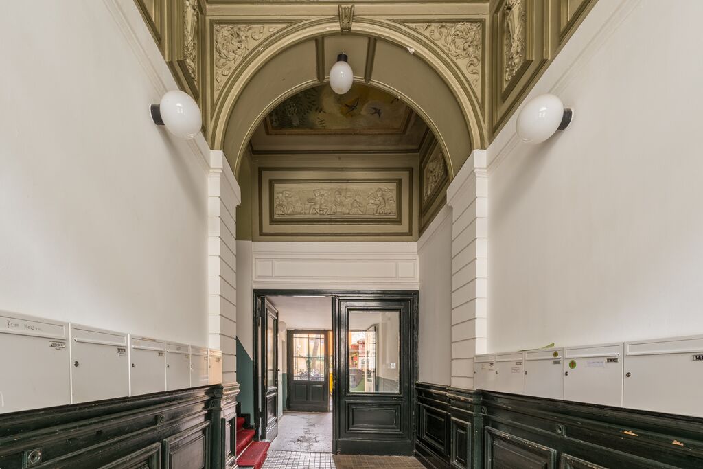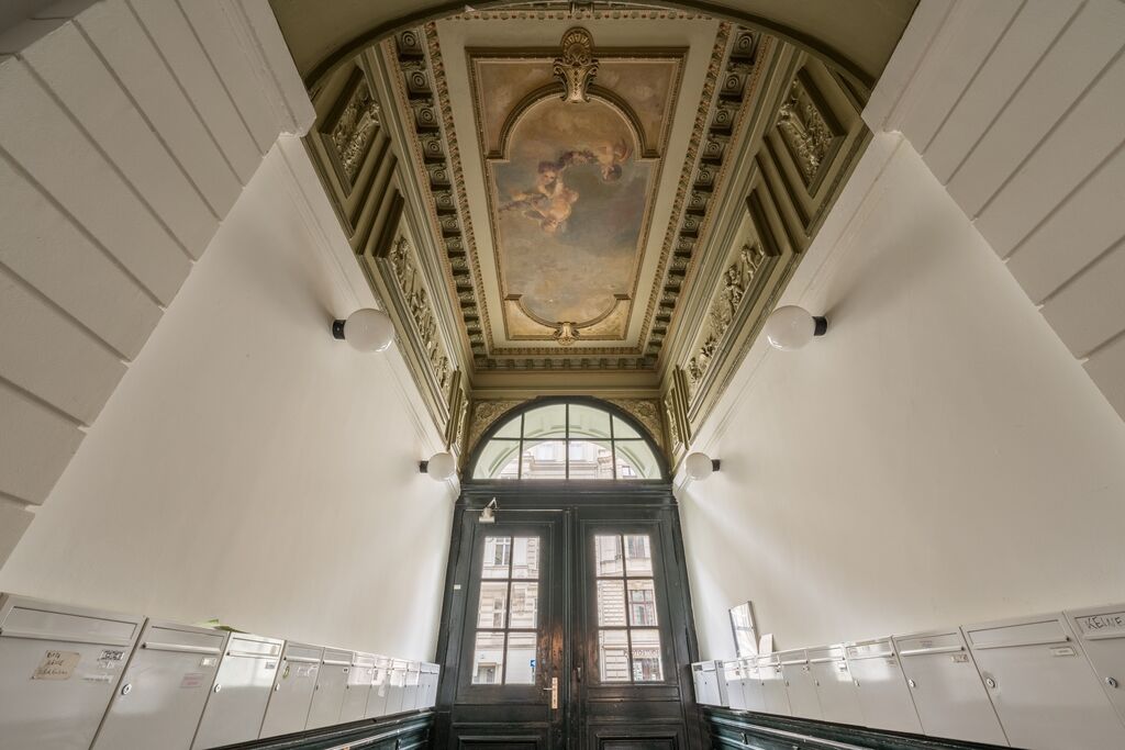 The five-story residential and commercial building, built at the turn of the century, consists of a front building and a side wing. The building was completely renovated in 1988 and underwent further modernization measures in 2001: attic conversion, new rise pipelines and renovation of the stairwell were carried out. During the renovation work, numerous plaster elements were carefully revised. Heating and hot water supply is provided by a gas floor heating system. The gas boiler was newly installed.