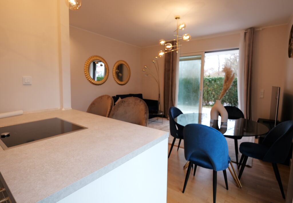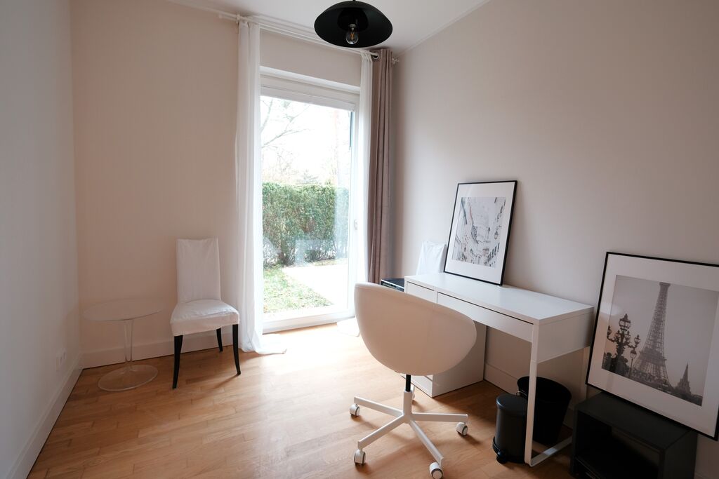 Wohnen auf einer Ebene und mit Privatgarten im vornehmen Wohnquartier Fünf Morgen. Hier haben Sie das Gefühl, wie im eigenen Haus zu wohnen. Mit ca. 79 Quadratmeter Wohnfläche erwartet Sie bei dieser 3-Zimmer-Wohnung samt Terrasse und Privatgarten mit einer Fläche von 102m² als Sondernutzungsrecht ein ganz außergewöhnliches Zuhause. Bereits von der Eingangsdiele samt Einbauschrank für die Garderobe schweift der Blick durch den loftartigen Wohn-, Ess- und Küchenbereich. Hier geht alles fließend ineinander über. Innenraum und Außenbereich verbinden sich zu einer harmonischen Einheit, denn die bodentiefen Fenster und große Panorama-Schiebetür schaffen schöne Sichtachsen. Herzstück ist der L-förmige Wohn-, Ess- und Küchenbereich mit Fenstern zu zwei Seiten, einer Kochinsel mit Cerankochfeld und Platz für Barhocker sowie die helle Küchenzeile mit Backofen, Spülmaschine und reichlich Stauraum. Von der Kochinsel haben Sie einen Blick in den Raum und in den Garten. Ein Esstisch und das gemütliche Sofa umfassen den Wohn-, Ess- und Küchenbereich. In den warmen Monaten findet das Leben auf der anschließenden Terrasse statt. Sie bietet Platz für Gartenliegen oder Sitzmöbel. Ein Teil der Terrasse ist überdacht und hat somit einen Wetterschutz. Der anschließende Gartenbereich, welcher die Wohnung an allen drei Seiten umgibt, ist von einer hohen Hecke umschlossen und somit nicht einsehbar. Auch das Schlafzimmer mit ca. 15 Quadratmeter besitzt einen Zugang zum Garten, denn zwei bodentiefe Fenstertüren lassen sich vollständig öffnen. Auch das kleinere Gäste/Arbeitszimmer hat einen Zugang zum Garten. Weiteres Highlight ist das Badezimmer mit Gartenzugang. Zur Ausstattung gehören die Badewanne, eine bodengleiche Rainshower-Dusche und die lange Waschtischkonsole im stylischen Look samt dem formschönen Handwaschbecken und der Design-Armatur. Hier können Sie sich erholen und zur Ruhe kommen. In einem separaten Raum befinden sich das WC und ein Handwaschbecken, was somit auch gleichzeitig als Gäste-WC dient. In allen Zimmern wurde hochwertiges Echtholz-Parkett verlegt und die Fußbodenheizung sowie die Außenjalousien sorgen für ein behagliches Raumklima. Es gibt ein Kellerabteil und ein Tiefgaragenstellplatz. Die Wohnung ist in einem neuwertigen, gepflegten Zustand. Entdecken Sie dieses Garten-Appartement der Extraklasse und ziehen Sie einfach ein!