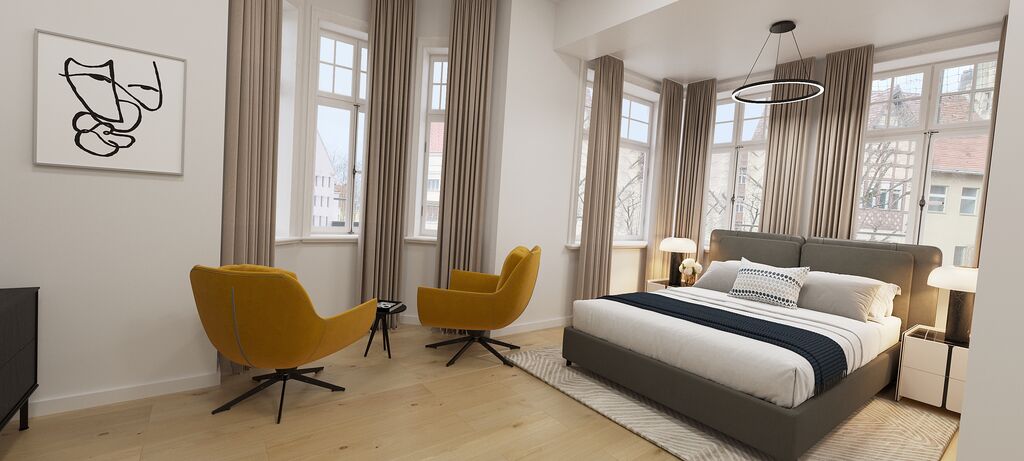 • Denkmalgerechte, großflächige doppeltverglaste Holzfenster aus einer renommierten Berliner Manufaktur.