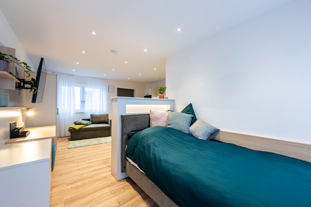 Hier bieten wir Ihnen einem modernen Neubau in höchster Energie- und Bauqualität nach dem Standard KfW 40 QNG traumhafte 1-Zimmer Neubauwohnungen an. In traumhafter Südausrichtung, zum Teil mit herrschaftlichem Bergblick entsteht hier moderner Wohnraum, der mit luxuriöser Ausstattung wie LED-Beleuchtung, einer hochwertigen 3er Küche sowie einer bodentiefen Luxusdusche punktet.